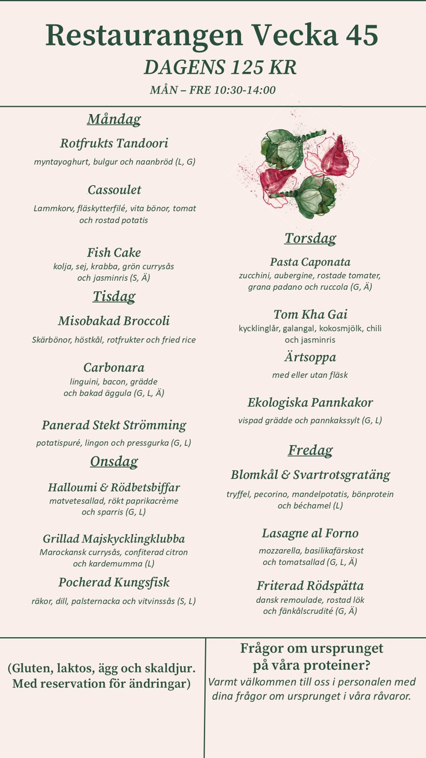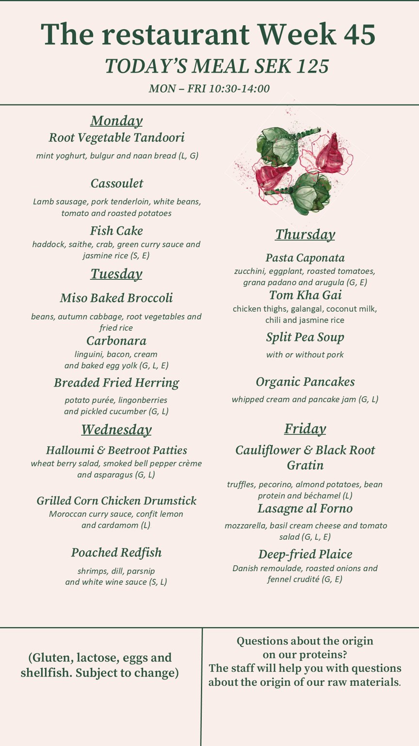 Vi vill att ni alla ska känna att det finns något som passar er… varje dag! Vi serverar tre rätter som byts dagligen - och ibland, när köket får feeling, kan det dyka upp en extra rätt. Många av våra rätter är baserade på våra härliga svenska klassiker. Men ibland med en liten twist. Vi önskar er en god lunch! Öppetider vardagar 10:30-14:00