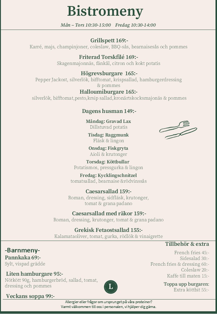 Bistron är vår a´la carte restaurang där du kan äta lunch i mysig miljö och lugn bakgrundsmusik. Maten tillagas vid beställning, vilket innebär att det tar en stund innan din mat blir klar. Men vi tycker att det är värt väntan. Öppettider: måndag-torsdag 10:30-15:00. Fredagar 10:30-14:00 Helger, aftnar & röda dagar stängt